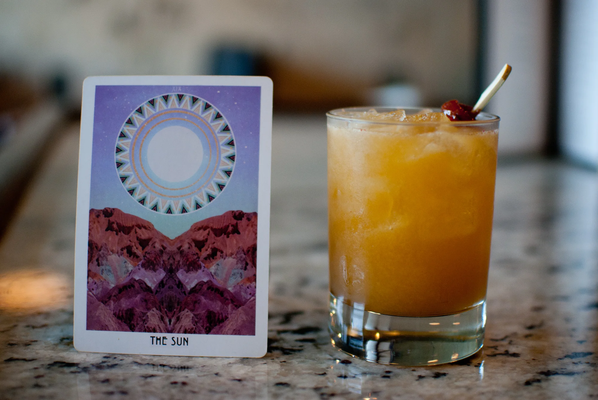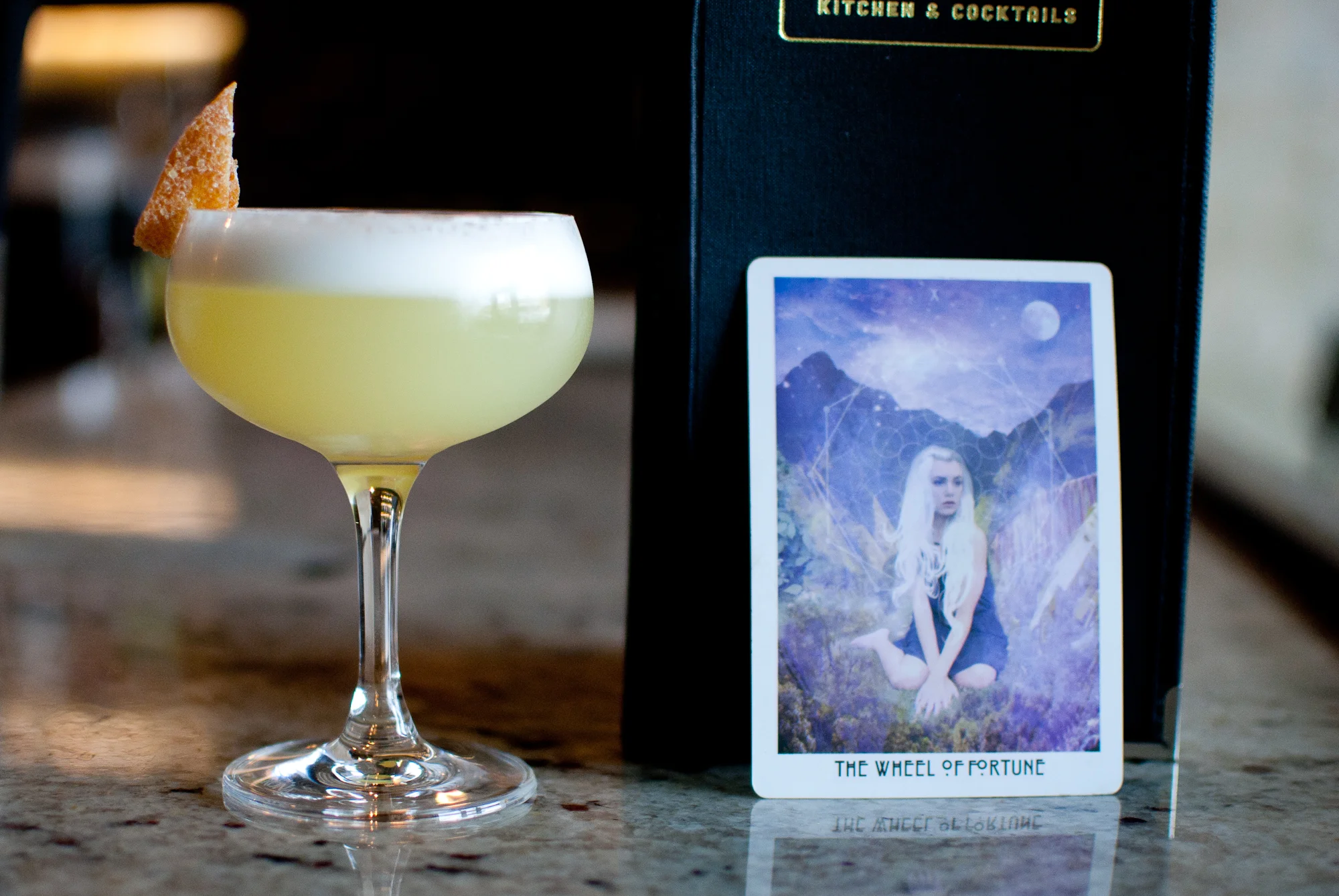 The Wheel of Fortune combines orange-infused Gin, Solerno Blood Orange Liqueur, orgeat almond syrup, vanilla syrup, egg white, and lemon, and is garnished with a candied orange peel. Each sip is a breath of fresh air, awakening the taste buds with its brightness, stirring up a feeling of nostalgia that reminds you of running barefoot in the summer as a little kid with an orange creamsicle. The Wheel of Fortune represents the life cycle, positive karmic energy, a turning point approaching in life, and the youthful spirit of this drink brings everything full-circle.