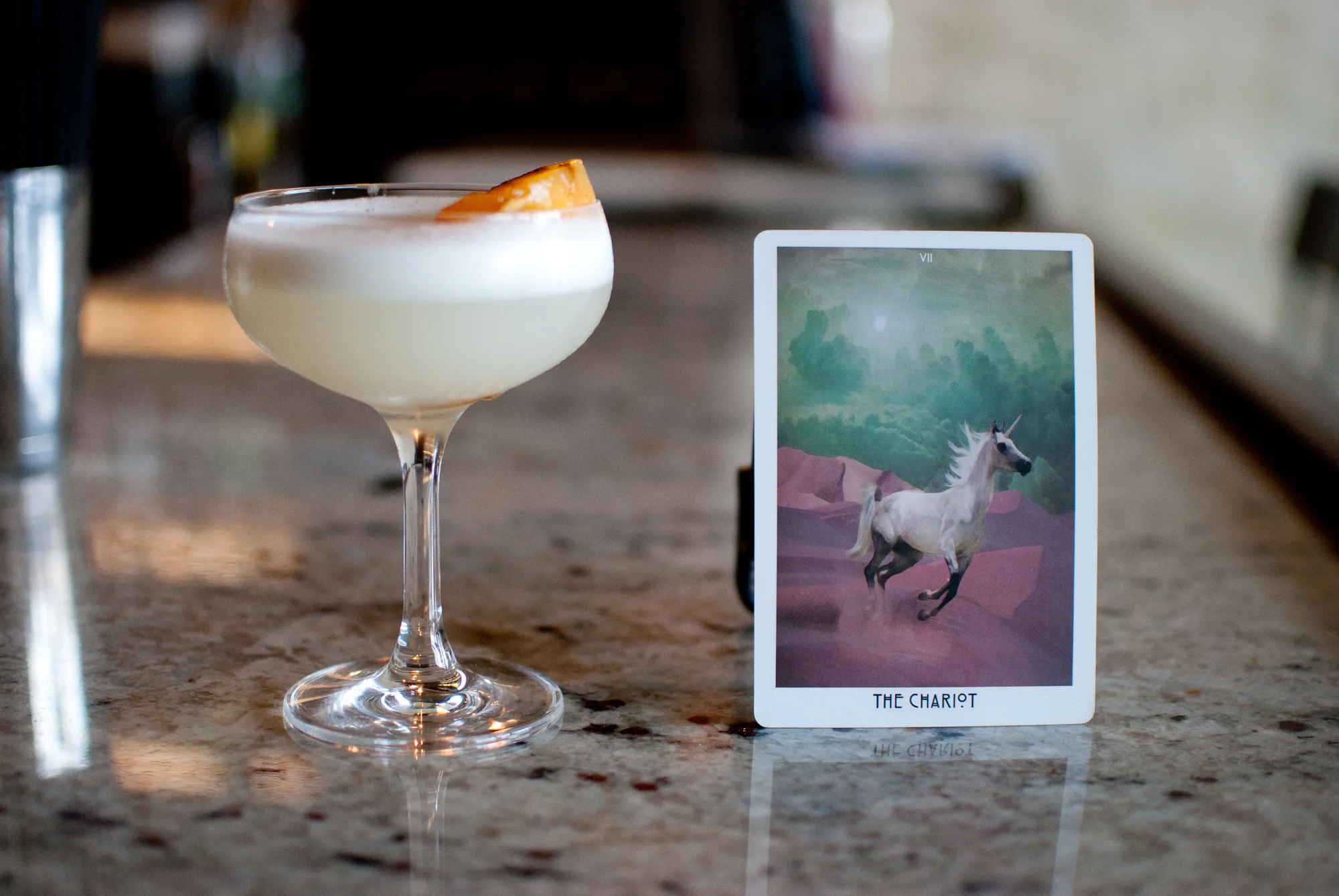 The Chariot brings together George Dickel white whiskey, creme de peche, creme de cacao, and lemon, and is garnished with a peach section drizzled with a balsamic vinaigrette. Slightly sweet, light in body, a gentle tang of citrus, and a combination of spring flavors that perfectly mask any bite from the white whiskey. This cocktail is smooth and flavorful, thoughtfully crafted, and expertly executed. The Chariot tarot card represents willpower, determination, and when pulled in a reading, typically depicts that travel will be happening soon, and this cocktail takes you straight to the beach.