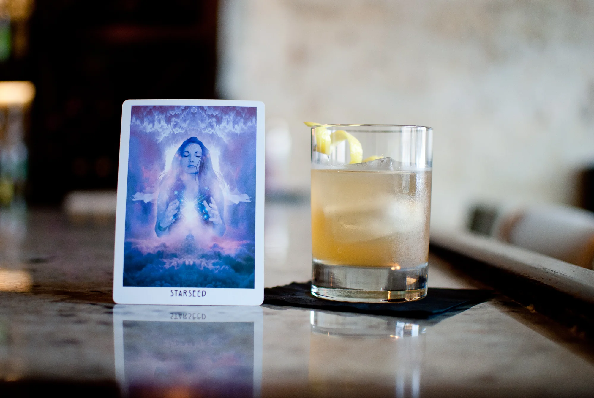The Fool combines Centenario Anejo tequila, Copper Kings apple brandy, St. George spiced pear liqueur, made-in-house tamarind syrup, and is garnished with a lemon peel and edible gold dust. From the heat of the tequila and richness of the brandy, all the flavors take their turn subtly hitting the palate. First the brandy, then the tequila, followed by the tamarind, with the sweetness of the pear lingering. In my deck, The Fool card is replaced by The Starseed, but still carries the same meaning of new beginnings and in turn, something else ending. This drink is the perfect transition of winter flavors brought into a refreshing spring cocktail.