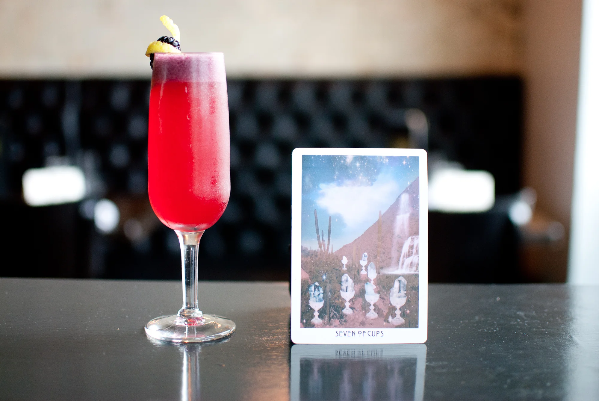 The Seven of Cups is made of lemon-infused New Amsterdam gin, J. Roget champagne, blackberry syrup, and lemon, and is garnished with blackberry and lemon peel. This pairing is a match made in heaven: the lemon pairs perfectly with the floral notes of the gin, and the tartness of the blackberries folds itself into the sweetness of the champagne. The Seven of Cups represents fantasy, illusion, and imagination, and this whimsical cocktail is a dream in itself.