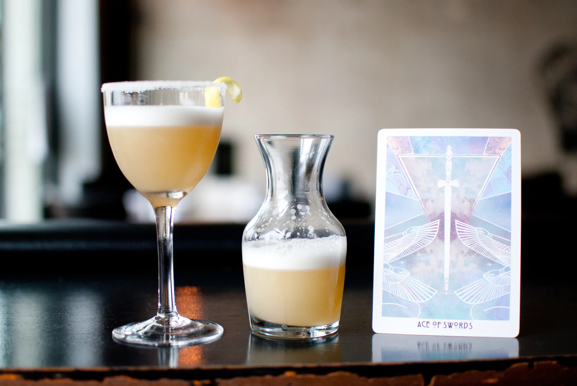 Ace of Swords brings together Western Son Yuzu vodka, Copper Kings apple brandy, St. George spiced pear liqueur, egg whites, and lemon, and is garnished with a sugar rim and lemon peel. The flavors of apple and pear take turns, with the Yuzu Vodka toning everything down with its earthy tones. The froth of the egg adds an unexpected texture to the light body of the drink, and the brightness of the citrus wakes up the senses. The Ace of Swords represents clarity, power, and victory, and all of the ingredients champion the arrival of the spring season.