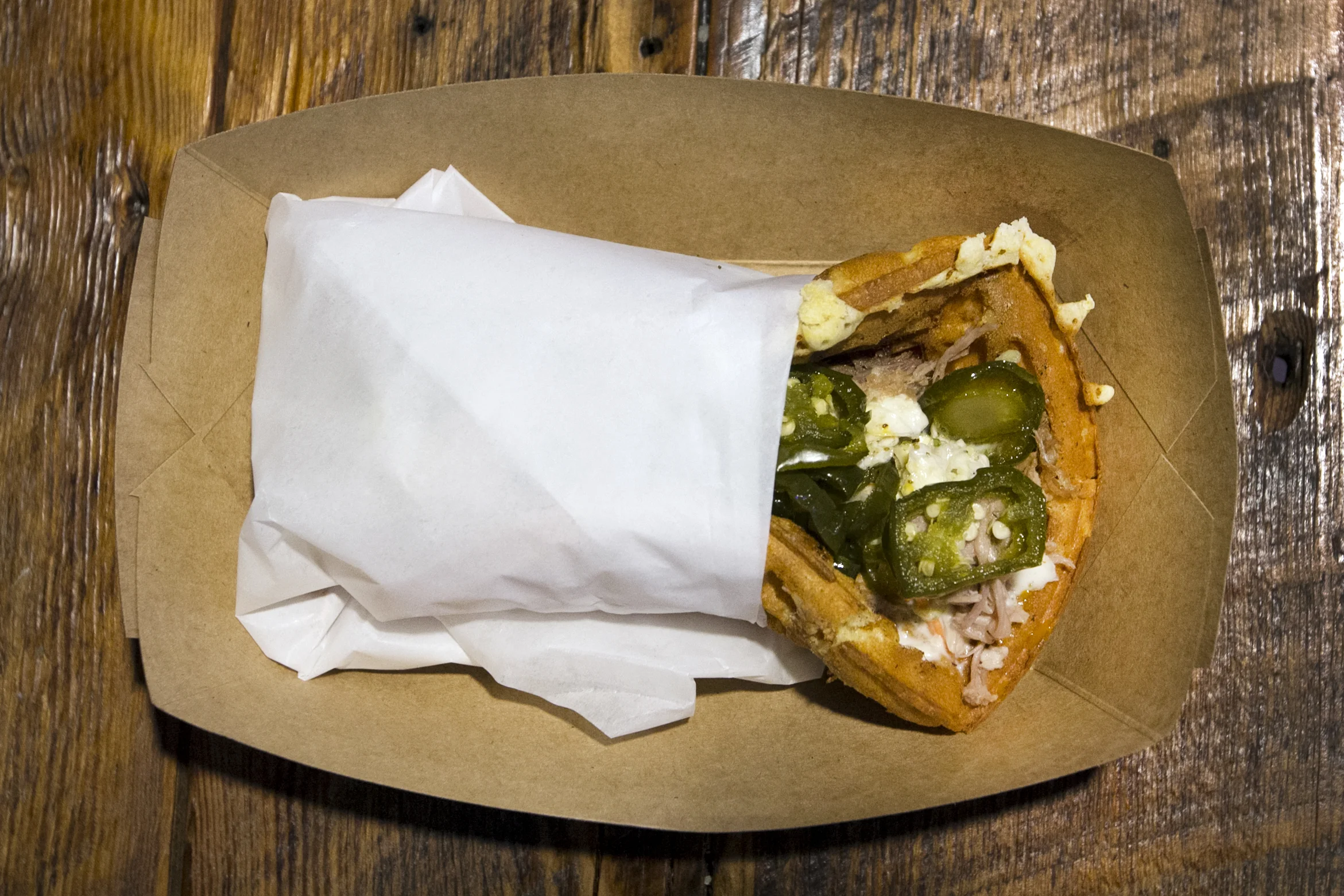 The Big Tex is a waffle filled with spicy chorizo, fluffy egg, cheddar cheese, cowboy candy (aka candied jalapenos), and a side of house made salsa verde. This greasy combination of savory ingredients, plus the heat of the cowboy candy, jalapenos that have been marinated in vinegar and sugar, is sure to cure what ails you. The coolness of the salsa verde brings the heat down and then lifts it back up on the back end so make sure you like your food with some spice.