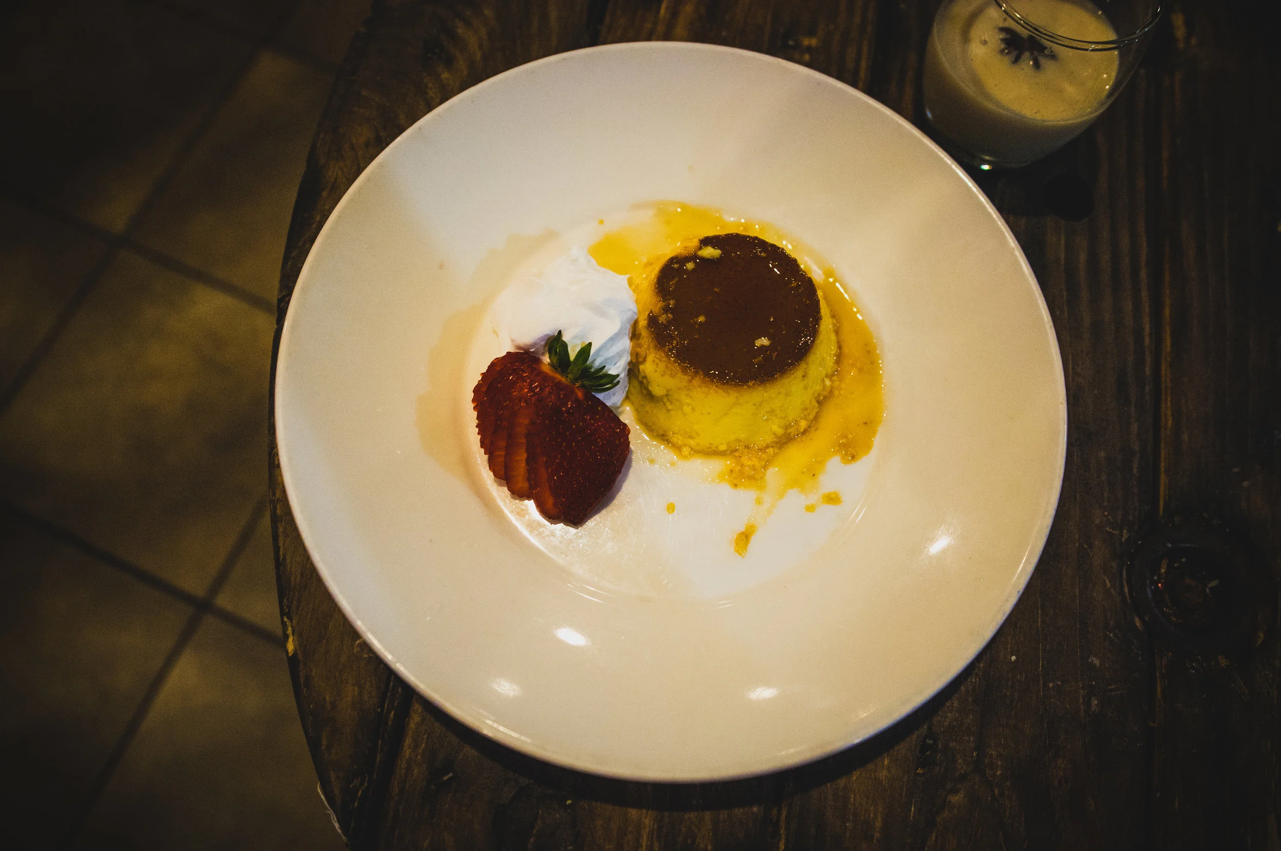 Paraíso Perdido - Tres Generaciones Añejo, coffee infused tequila, half-n-half with a hint of lavender, sweetened with homemade flan honey and condensed milk. Served with a Flan.