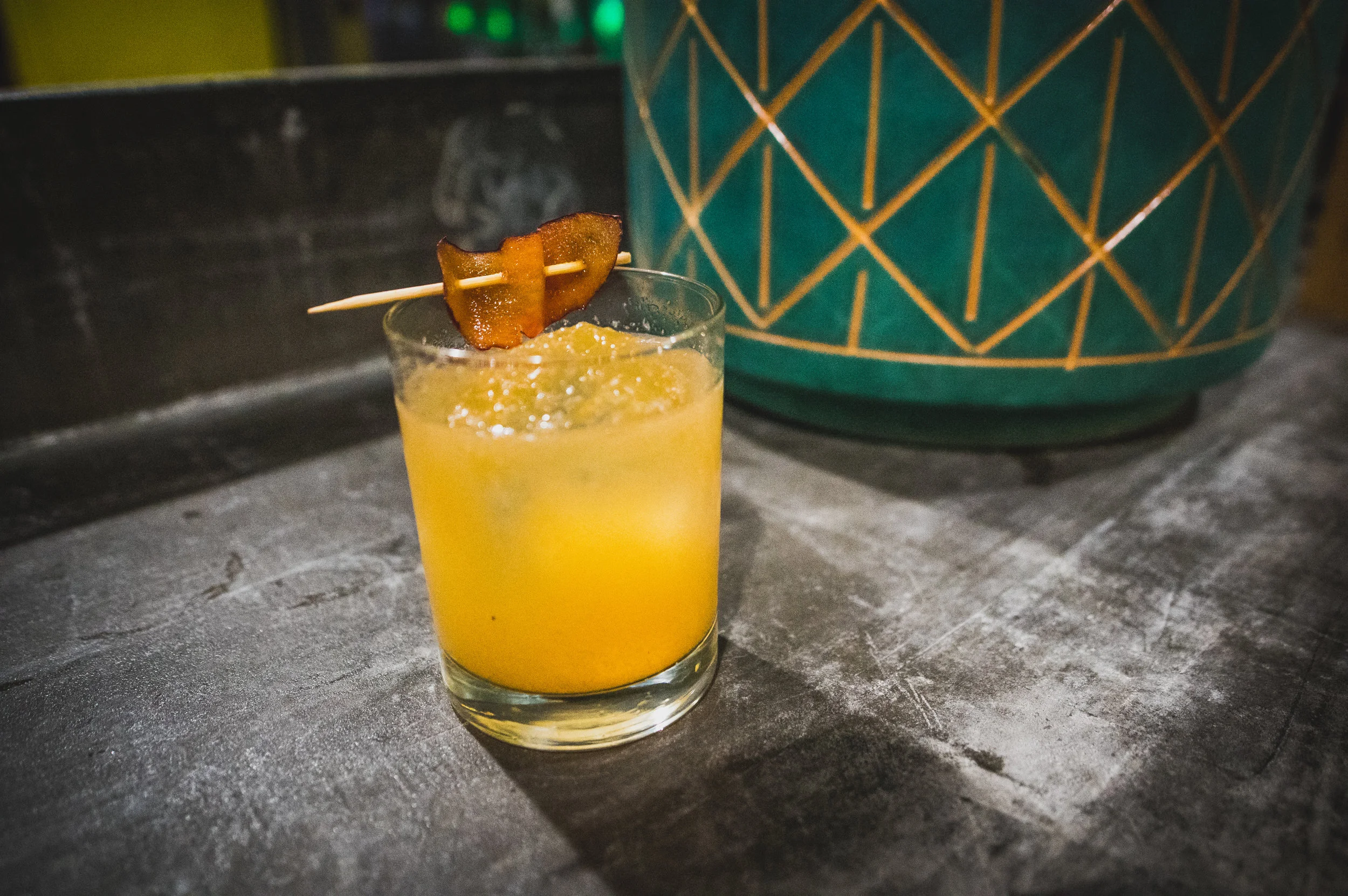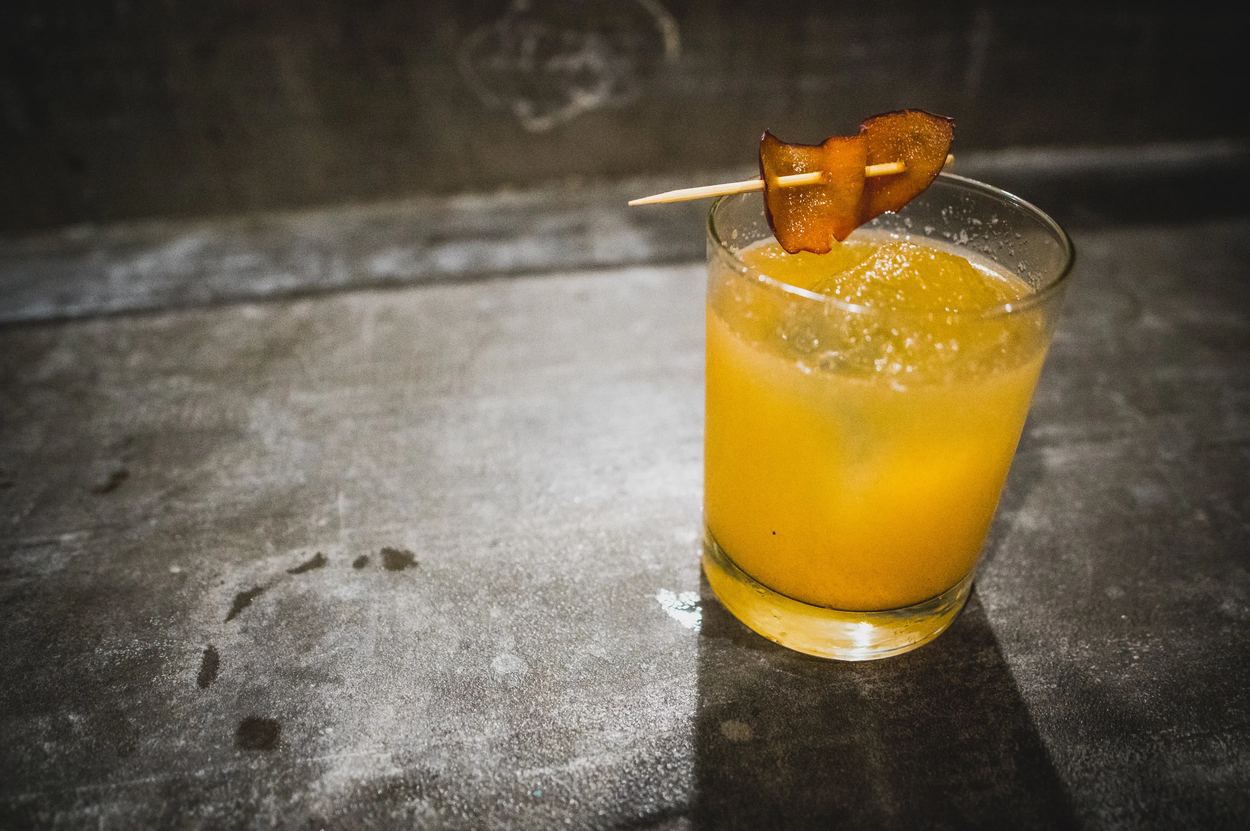 Like the cacophony of a firework finale, the Smoking Mirror comes in hot as the brightest burning star of the show. With a litany of different flavors born from a length rap sheet, the cocktail boasts a smoky front that, once the haze clears, leads into a nice spicy sweetness with saccharine undertones and a nice bit of fruit. The spice leaves a nice savory burn in the back of the throat, but the mouth is refreshed by the zing of spices and the bouquet of fruit flavors. The plumb skin garnish resembles a strip of bacon, which one would not be remiss in thinking, for it encapsulates the sweet and smoky flavors within. The fruit notes linger on the tongue, while the mezcal and habanero wash backwards down the throat, warming the soul as much as it does the palate.
